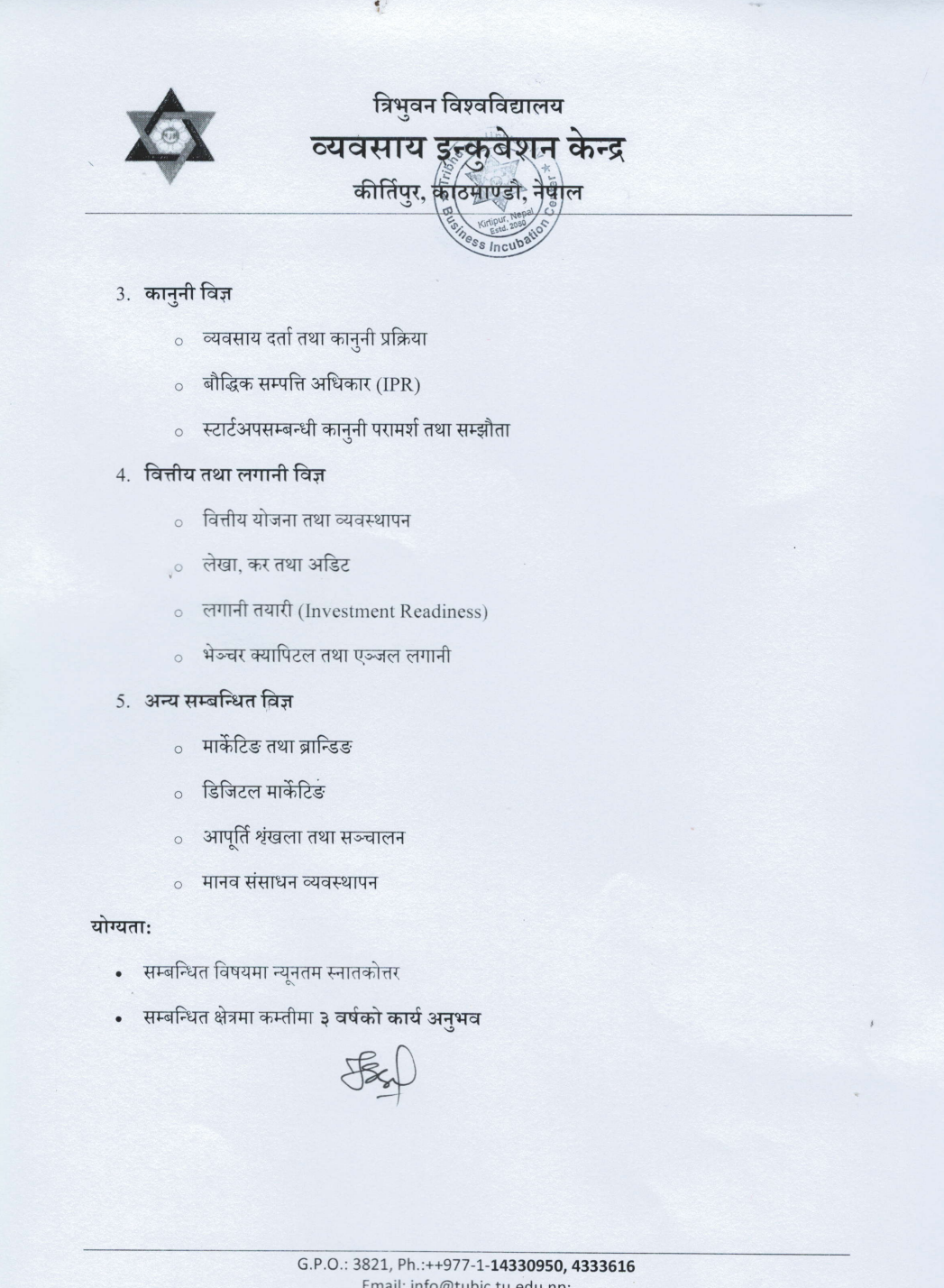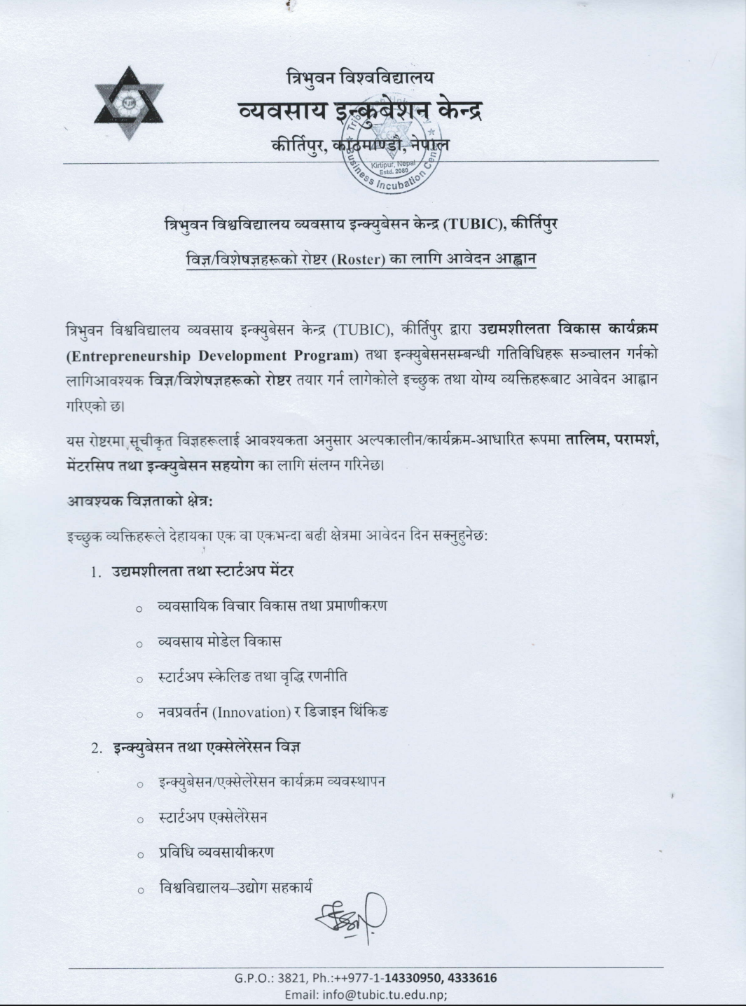 TUBIC विज्ञ_विशेषज्ञको रोष्टर (Roster) का लागि आवेदन आब्हान