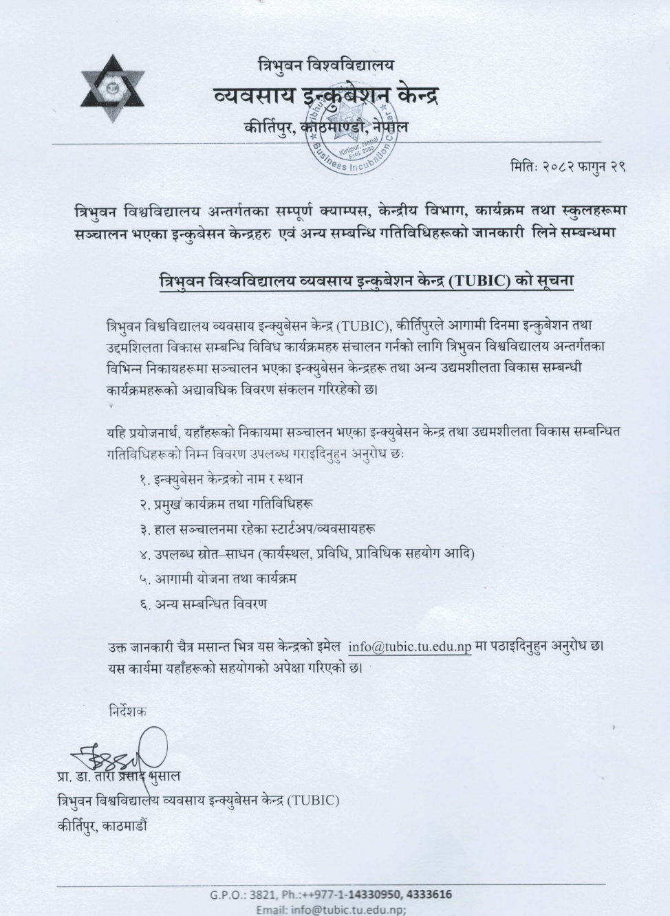 त्रिभिवन विश्_वविद्यालय व्यवसाय इन्कुवेशन केन्द्र (TUBIC) को सूचना